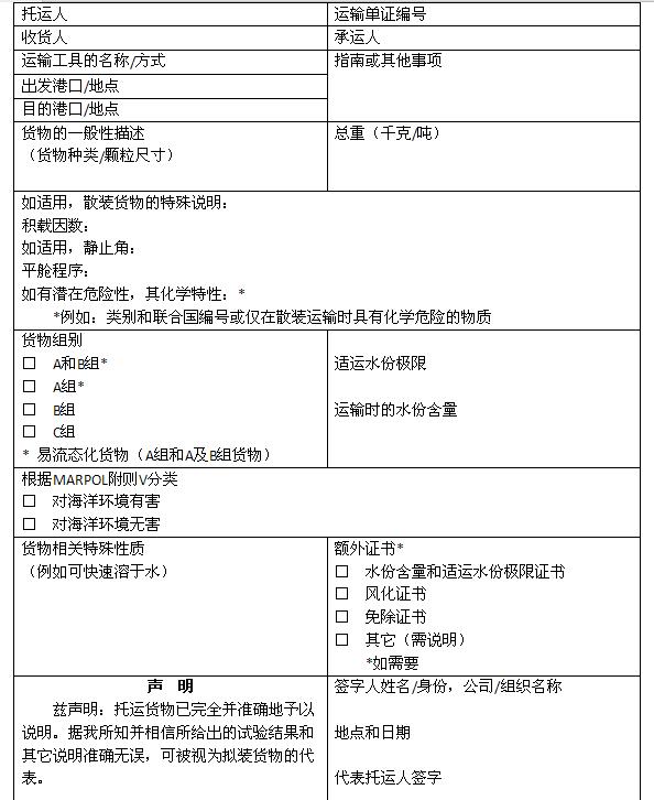 船方應(yīng)當(dāng)要求托運(yùn)人對(duì)其托運(yùn)的貨物是否對(duì)海洋環(huán)境有害進(jìn)行申明(申明格式見附件2),并將申明隨船保存至少兩年。